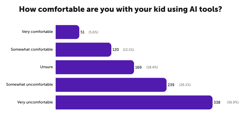 In January 2026, we surveyed 918 parents in our community. The headline finding? Less than 20% of parents are comfortable with their children using any kind of AI. And, around 60% are “somewhat uncomfortable” or “very uncomfortable” with their kids using artificial intelligence.
